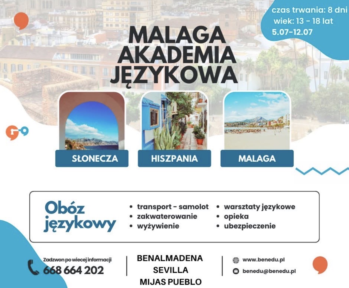MALAGA – AKADEMIA JĘZYKOWA Nasz kolejny wyjazd językowy z uczniami BENEDU staje się faktem! 8 dni w słonecznej Hiszpanii!! -wiek: 13–18 lat -termin: 5–12.07 przelot samolotem, zakwaterowanie i wyżywienie, warsztaty językowe, opieka i ubezpieczenie! ZOSTAŁO TYLKO 10 MIEJSC! Kto pierwszy, ten lepszy – decyduje kolejność zgłoszeń! To idealne połączenie nauki języka, wakacyjnej przygody i sprawdzonej opieki Masz pytania? Zadzwoń: 668 664 202 lub napisz benedu@benedu.pl Napisz do nas lub zgłoś się już dziś!